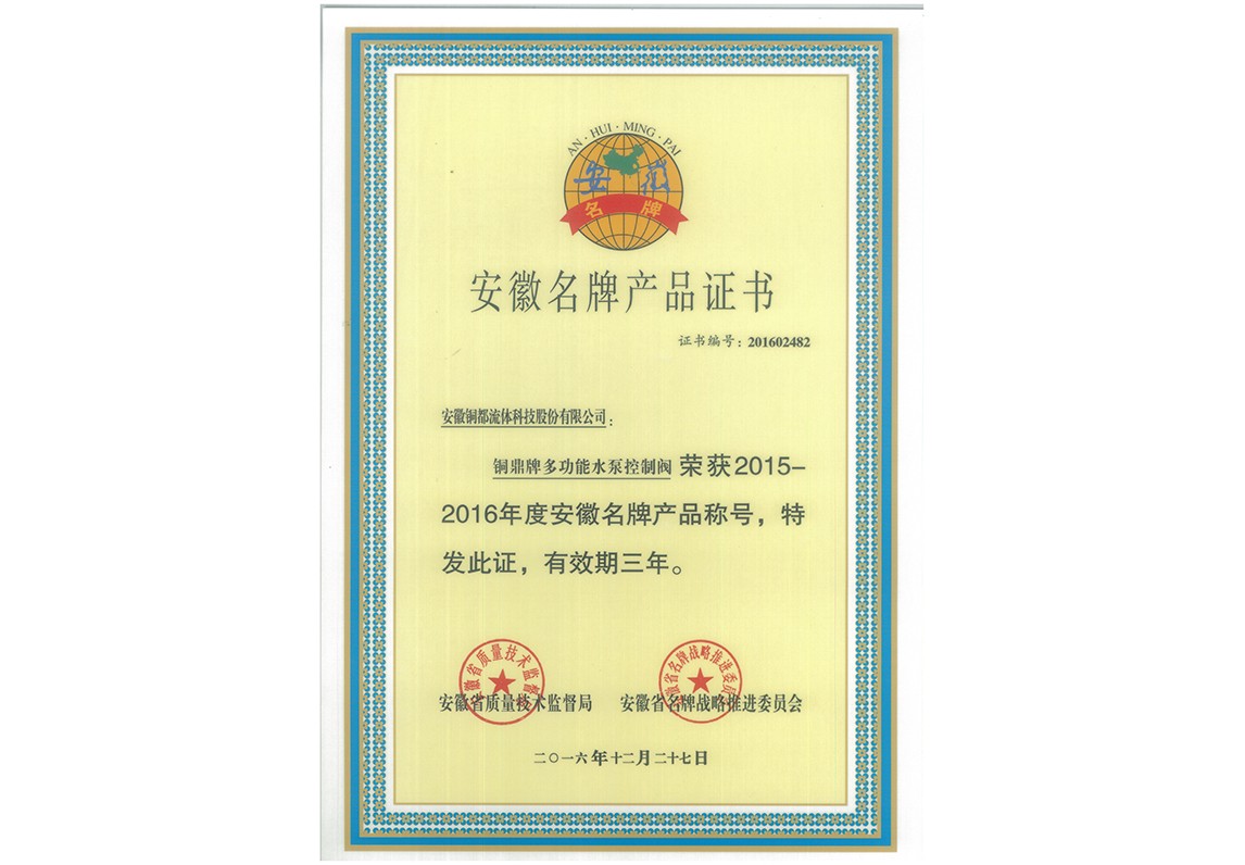多功能水泵控制閥-名牌產(chǎn)品證書