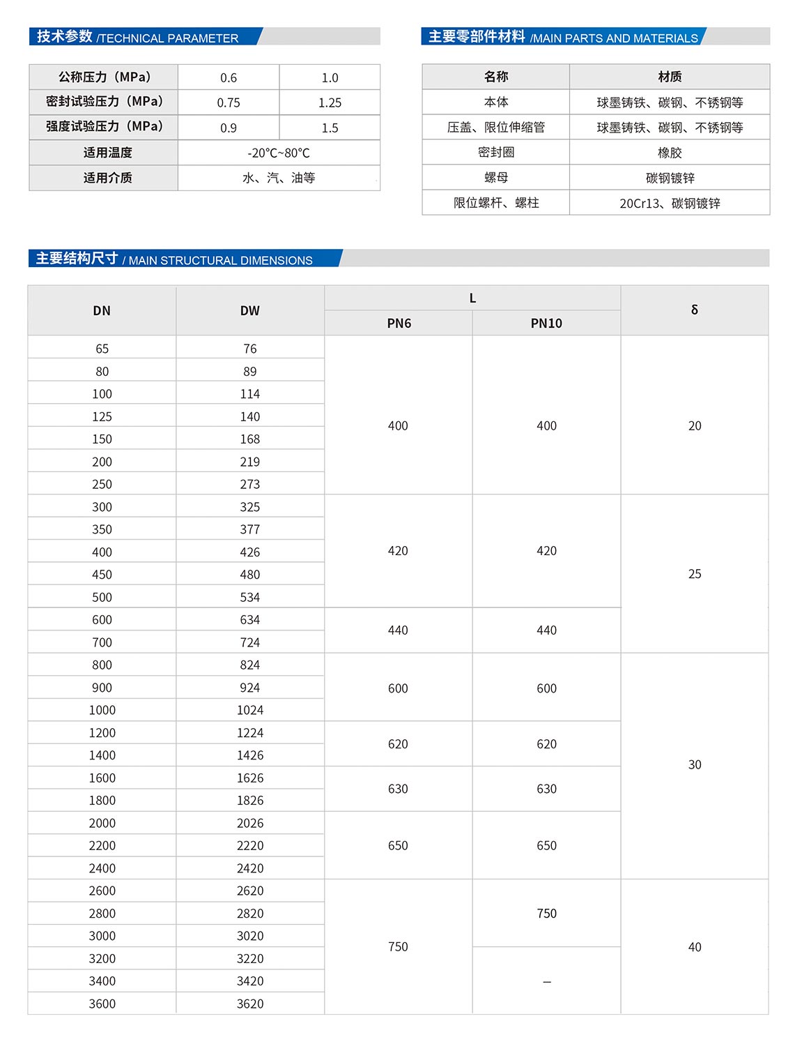 雙法蘭傳力接頭:由本體,密封圈,壓蓋,伸縮短管等主要部件組成。該產(chǎn)品適用于兩邊均為法蘭連接的管道中,安裝時(shí)調(diào)節(jié)產(chǎn)品兩端的法蘭的安裝長(zhǎng)度,對(duì)角均勻擰緊壓蓋螺栓,使其成為一個(gè)整體,并有一定的調(diào)節(jié)量,方便安裝維修時(shí),根據(jù)現(xiàn)場(chǎng)尺寸進(jìn)行調(diào)整。在工作時(shí)可以反軸向推力傳遞至整個(gè)管道。雙法蘭傳力接頭是由法蘭松套伸縮接頭和短管法蘭,傳力螺桿等構(gòu)件組成,能降低被連接件的壓力推力(盲板力)和補(bǔ)償管路安裝誤差。雙法蘭傳力接主要用于泵、閥門(mén)等附件的松套連接。